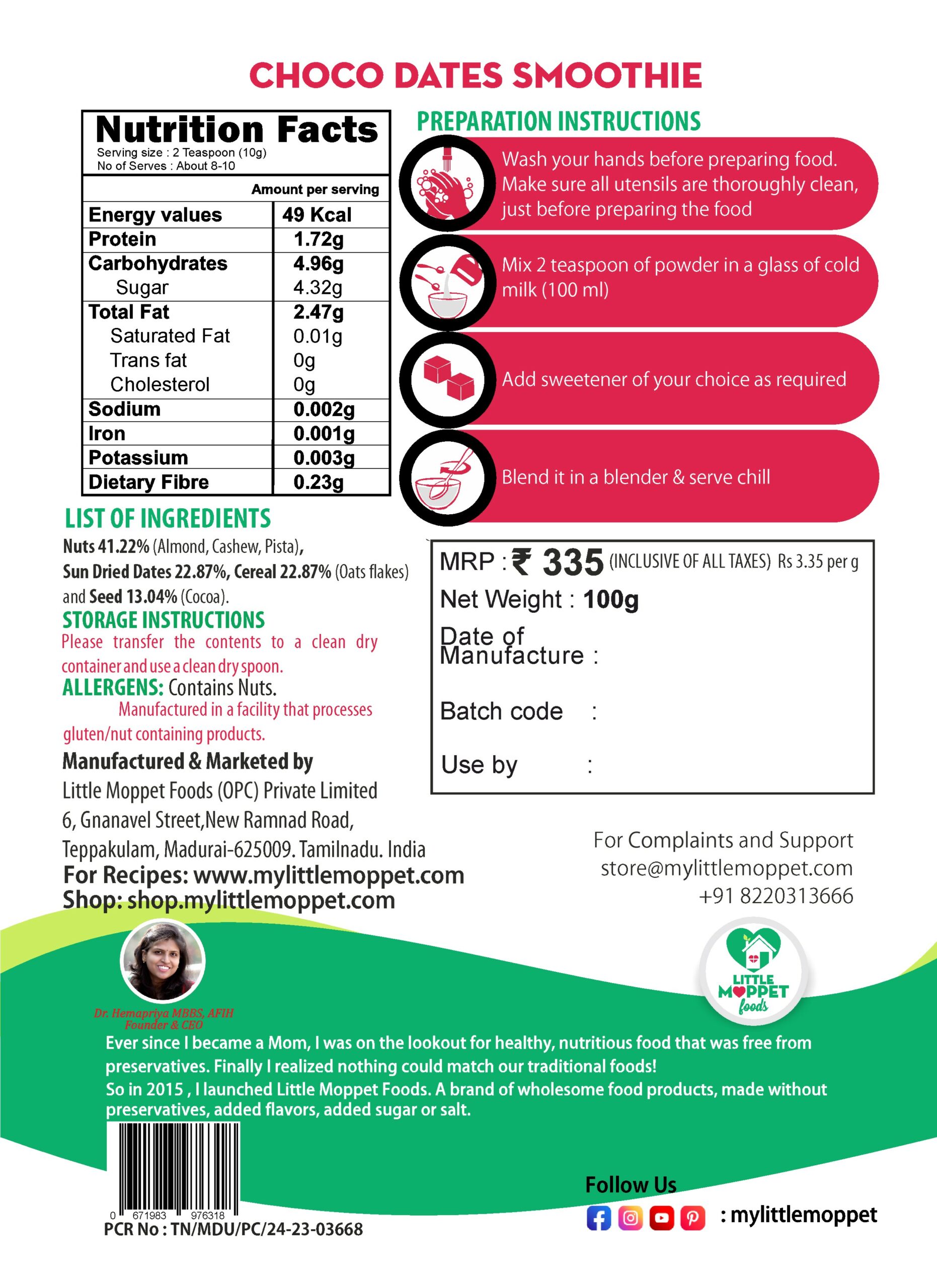 Yes, Little Moppet Foods’ Choco Dates Smoothie is truly a wonder mix! And it’s all the more so because it doesn’t contain any sort of added flavors or preservatives. All you can taste is the sweetness of dates, the richness of the nuts and of course, the delicious chocolate!