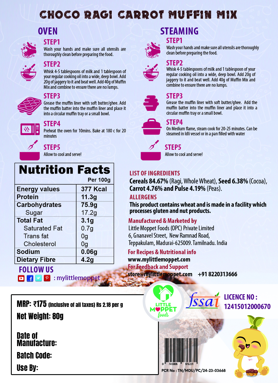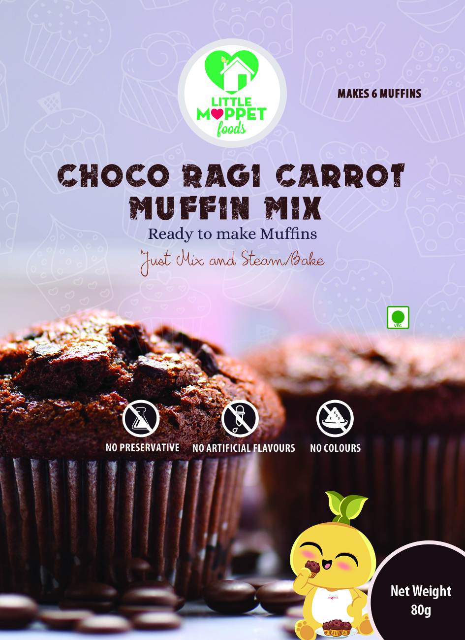 The Little Moppet Foods Choco Ragi Carrot Muffins Mix is a ready-to-use mix that can be steamed or baked.