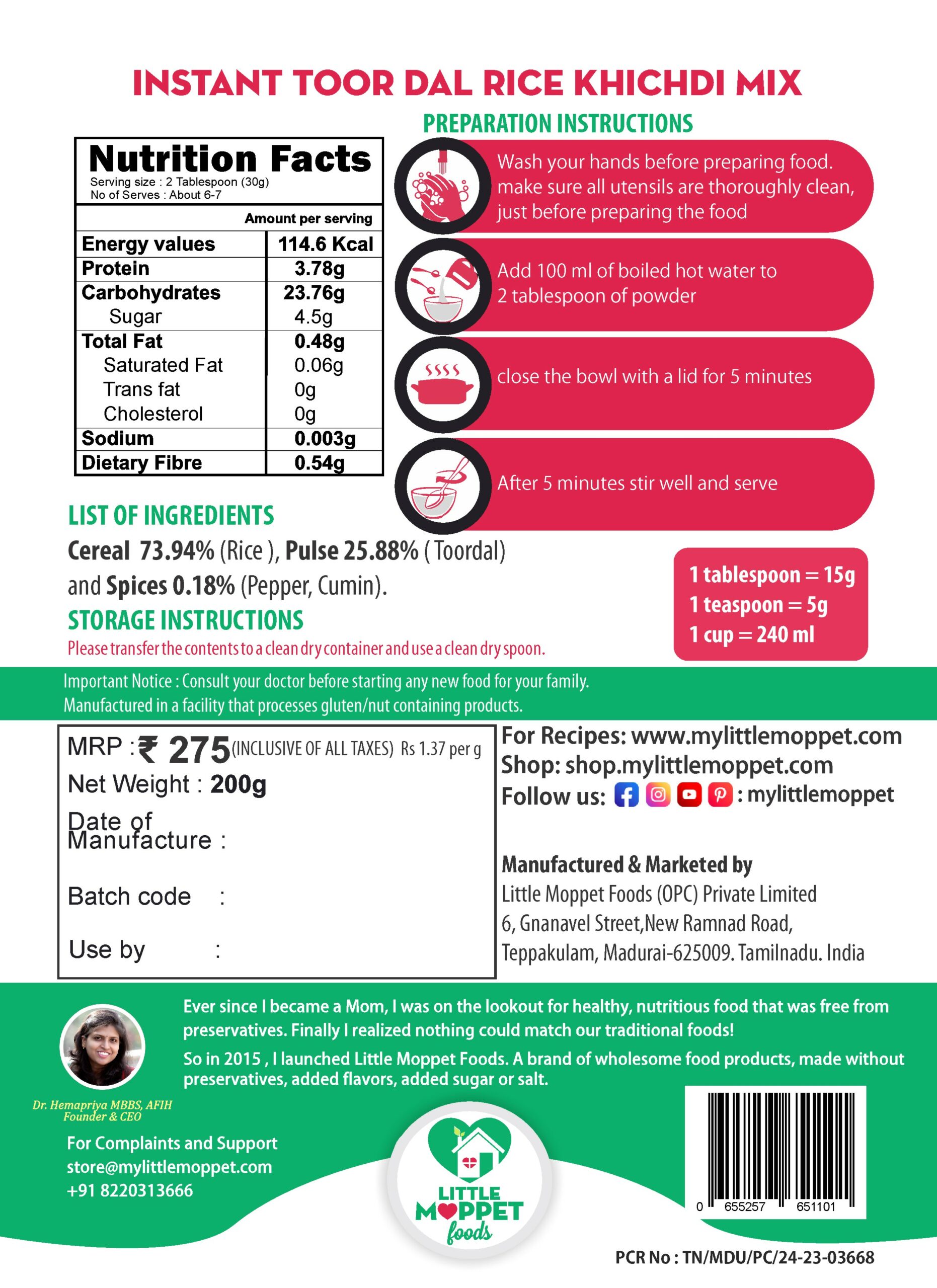 - Like all Little Moppet Foods, our Instant Khichdi mix is made at home under a doctor mom’s supervision